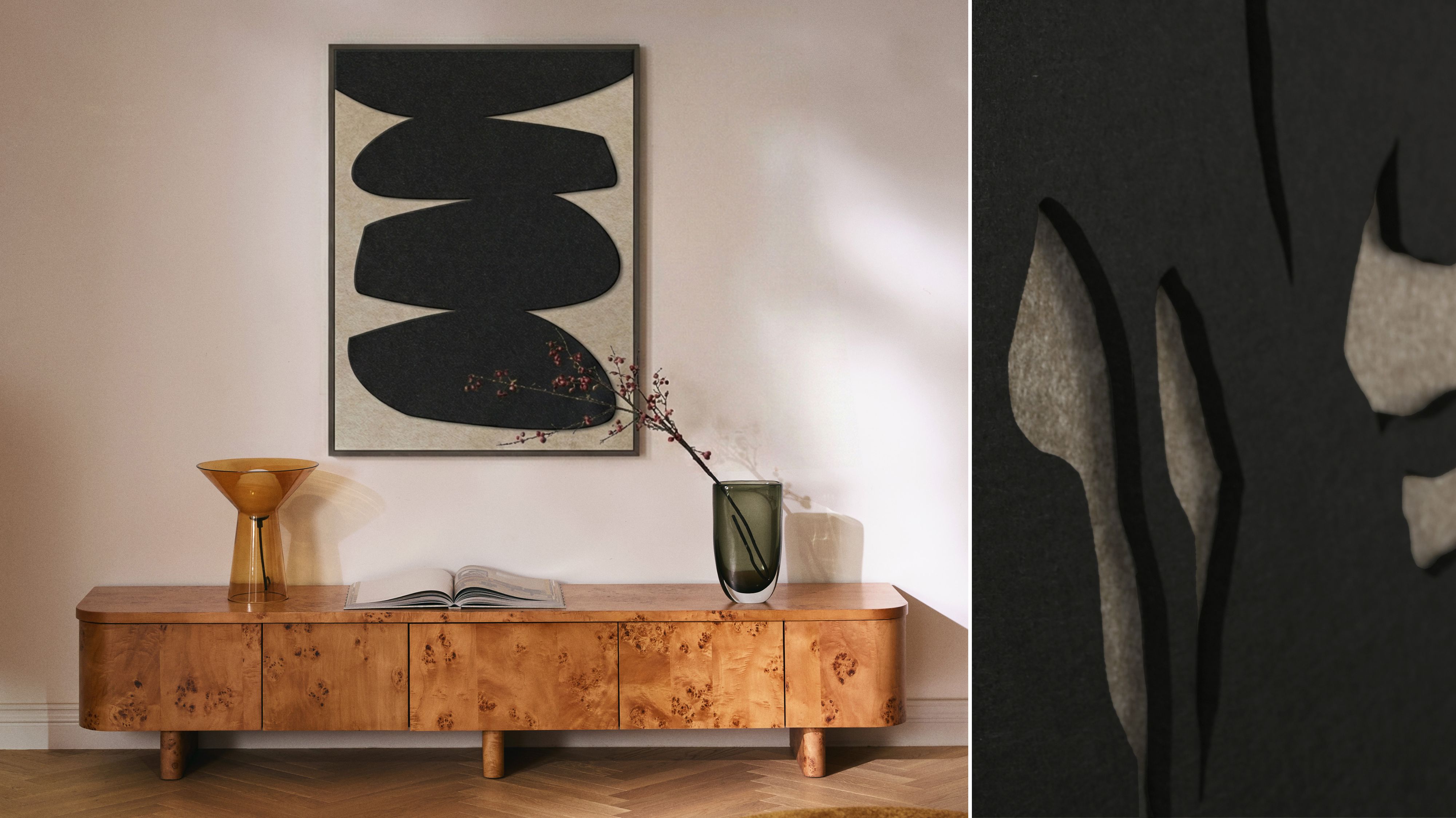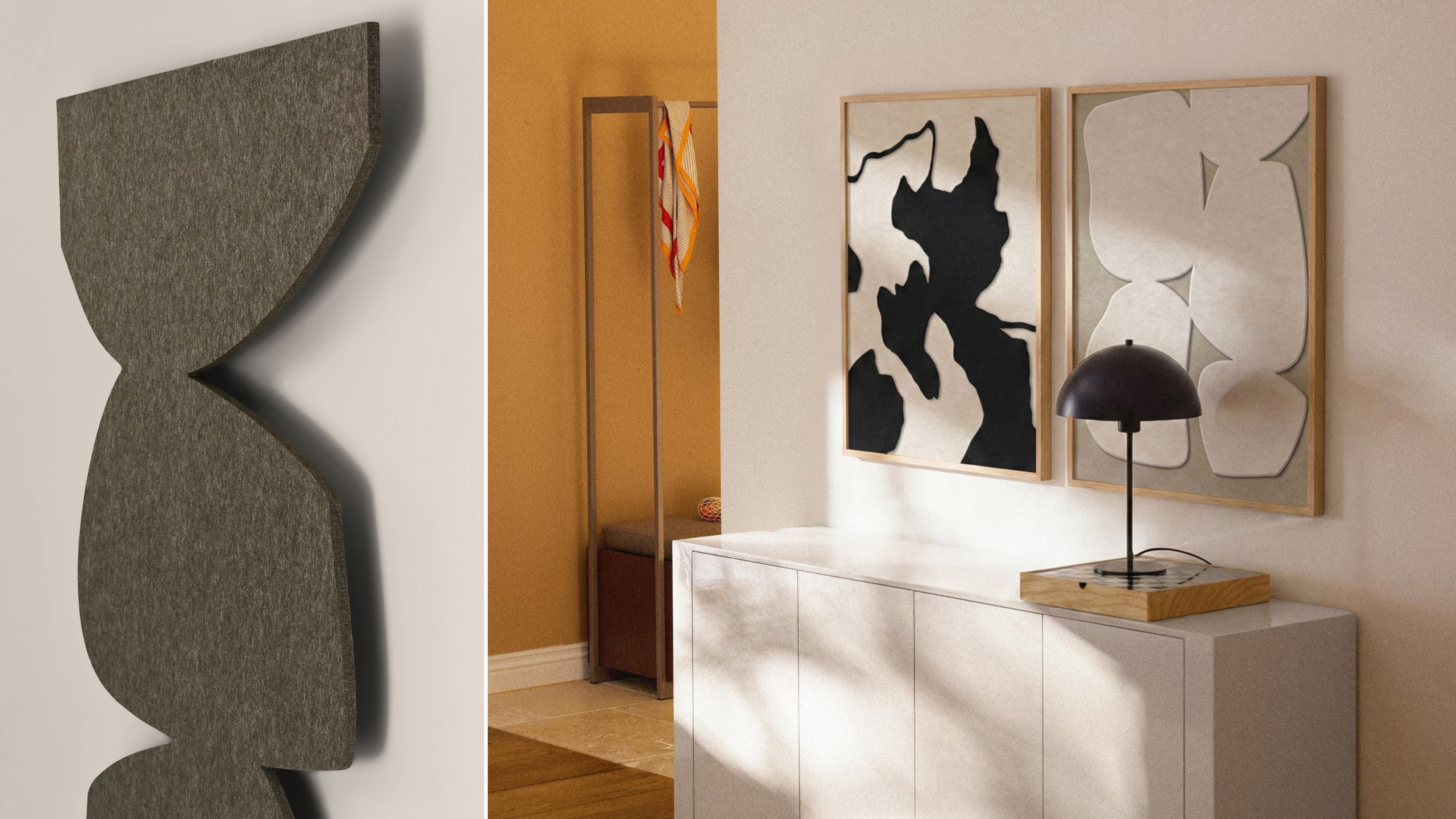 Acoustic Art is particularly effective on larger wall surfaces. Placing two or more elements side by side increases the absorbent area and significantly intensifies the effect. At the same time, a curated overall look emerges: serene in soft beige tones or striking in black-and-white combinations.