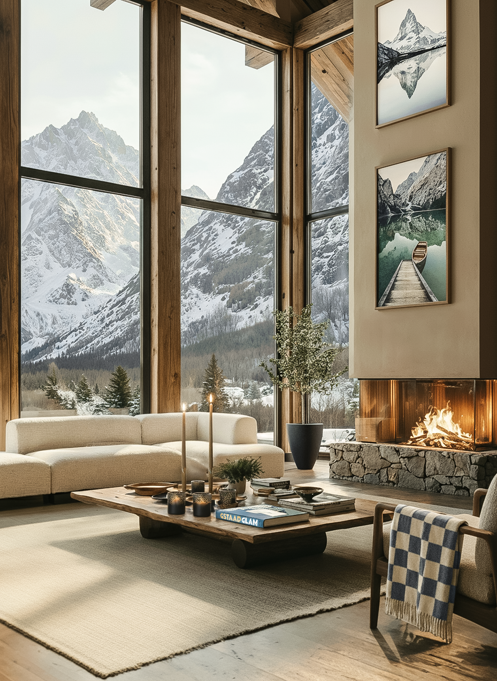 The chalet look thrives on tactile contrasts. Bouclé and wool bring warmth and structure, while stone or metal add a cooler edge. Balance is key: a sheepskin armchair beside a side table in polished brass creates tension and a modern aesthetic.
