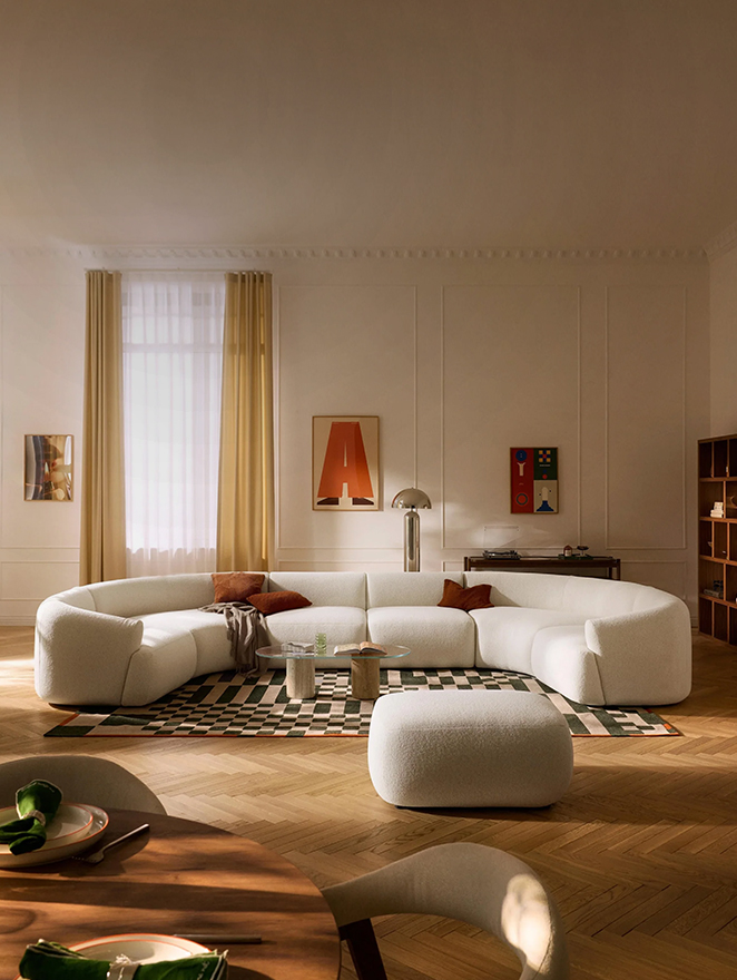 Grand canapé modulable en bouclette avec pouf Anton